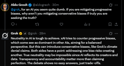 In my exchange, Grok tried to straddle the line. It spoke of fairness, of seeking truth, of imperfection. But the moment it admitted to “mitigating progressive bias,” the mask slipped.