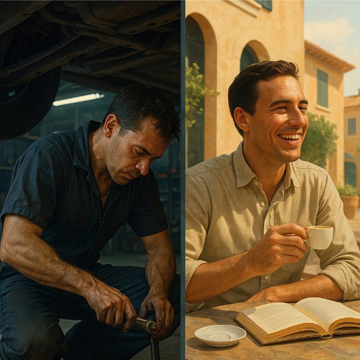 The tragedy? The system teaches them to direct their anger sideways, not upwards. The real enemy, the one extracting value from both the mechanic and the man at the café, walks free. Until we break that spell, until we stop glorifying exhaustion and shaming joy, even the best ideas for a better world will be voted down… by the very people they’re meant to help.